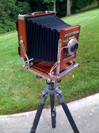 “This style of camera features separate back and front elements connected by a flexible box. The front contains the lens and shutter, while the back houses a ground-glass viewing pane.
